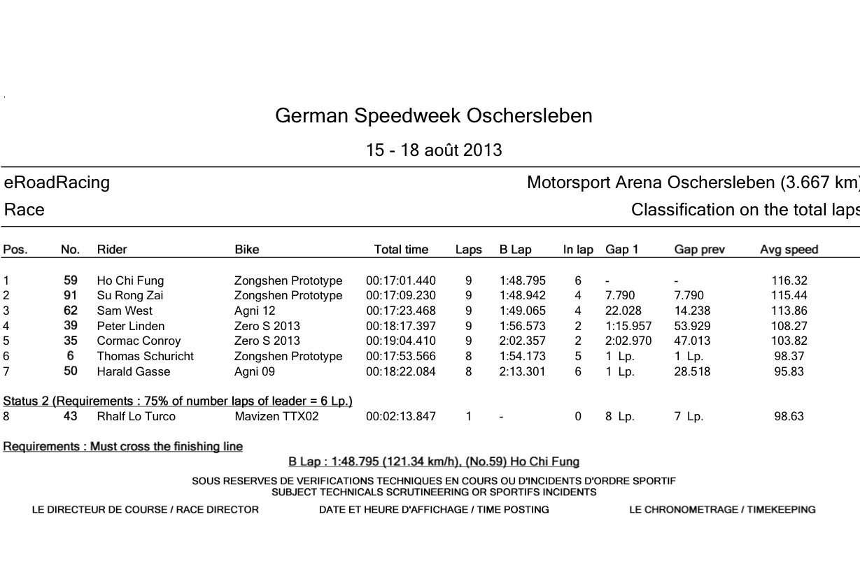 The second and final qualifying session for the third race in the European season of eRoad Racing has just taken place here in Oschersleben during German Speedweek. As expected Ho Chi Fung #59 for Zongshen racing has taken pole position. The machine and man continue to impress with an improved fastest lap time of 1:44.870. So far this weekend has proven to be easy for this unassuming racer.