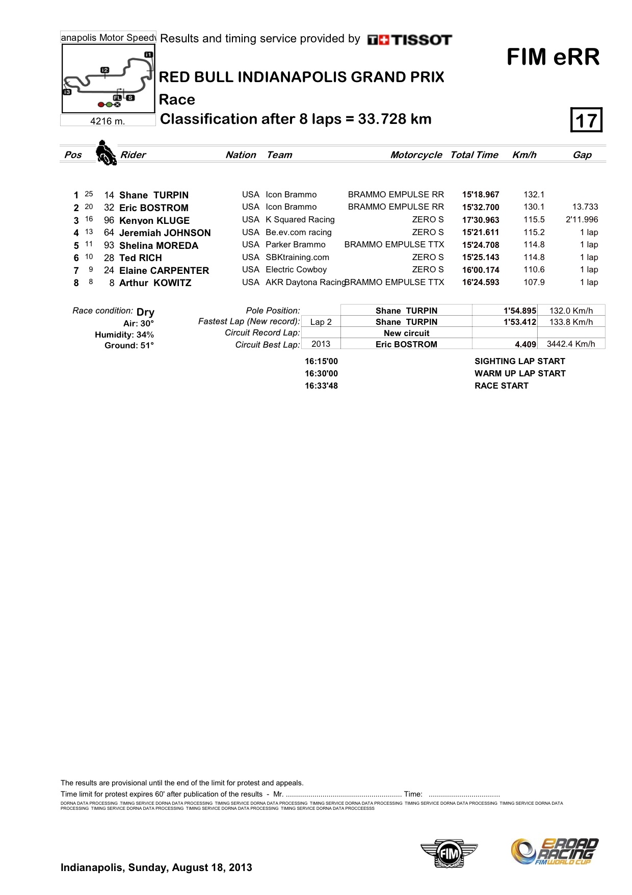 Shane Turpin won the first-ever, eight-lap FIM eRoad Racing World Cup race at the historic Indianapolis Motor Speedway this afternoon, beating team mate Eric Bostrom by 13.733 seconds. Kenyon Kluge finished third.
